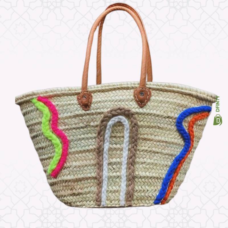 Découvrez ce sac en paille artisanal marocain, orné de motifs géométriques et de fils de laine dans un arc-en-ciel de couleurs.